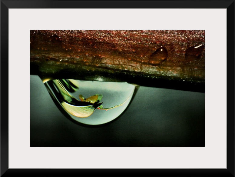 <p>A rain drop hanging from a branch with reflections of a leaf</p>