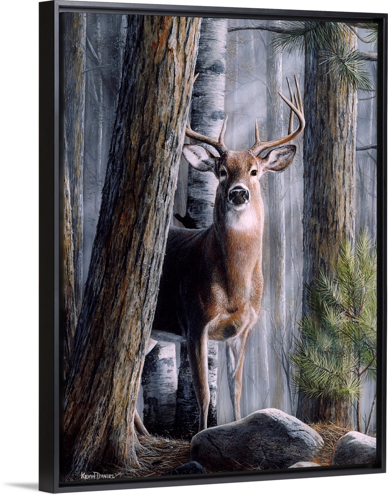 <p>A large stag is drawn peering out from behind pine trees in a thick forest.</p>