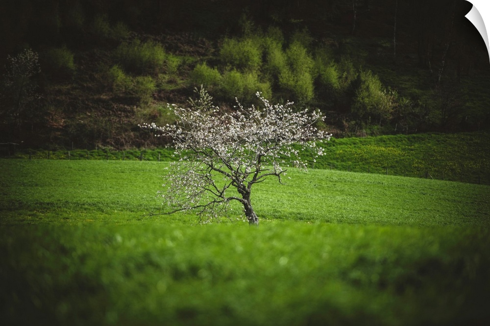 <p>Landscape - A solitary tree stands in the middle of a lush green field, its branches adorned with delicate white blossoms. The backdrop features a dense forest, creating a vivid contrast between the vibrant greenery and the darker tones.</p>