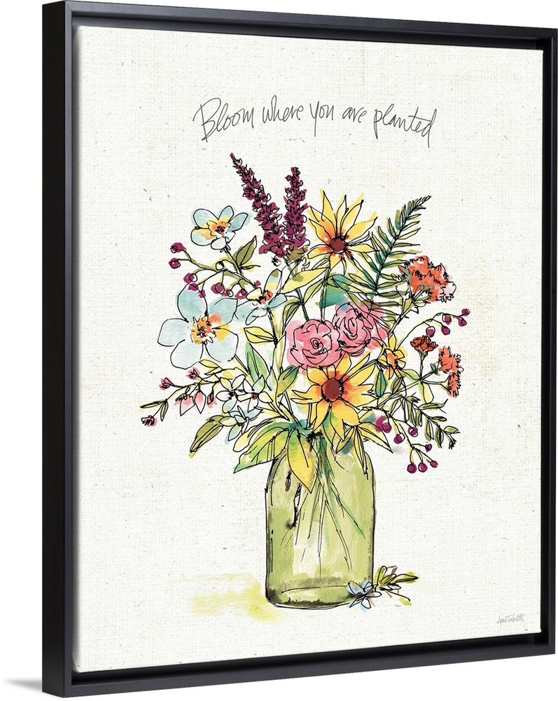 <p>Vertical creative artwork of a vase of wildflowers with the text "Bloom where you are planted".</p>