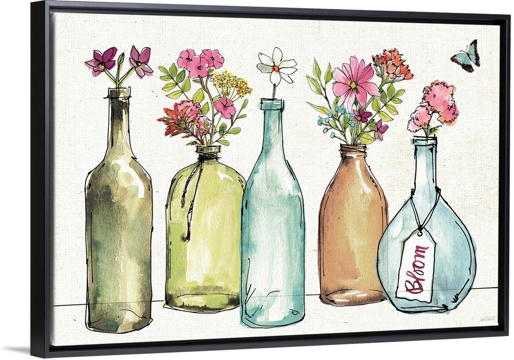 <p>Decorative artwork of vivid wildflowers in vases among ferns on a weaved textured backdrop.</p>