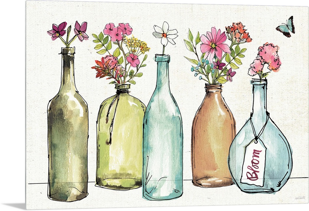 <p>Decorative artwork of vivid wildflowers in vases among ferns on a weaved textured backdrop.</p>