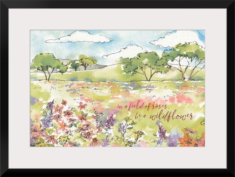 <p>A watercolor painting of a country scene of wildflowers in a field and the text "in a field of roses, be a wildflower".</p>