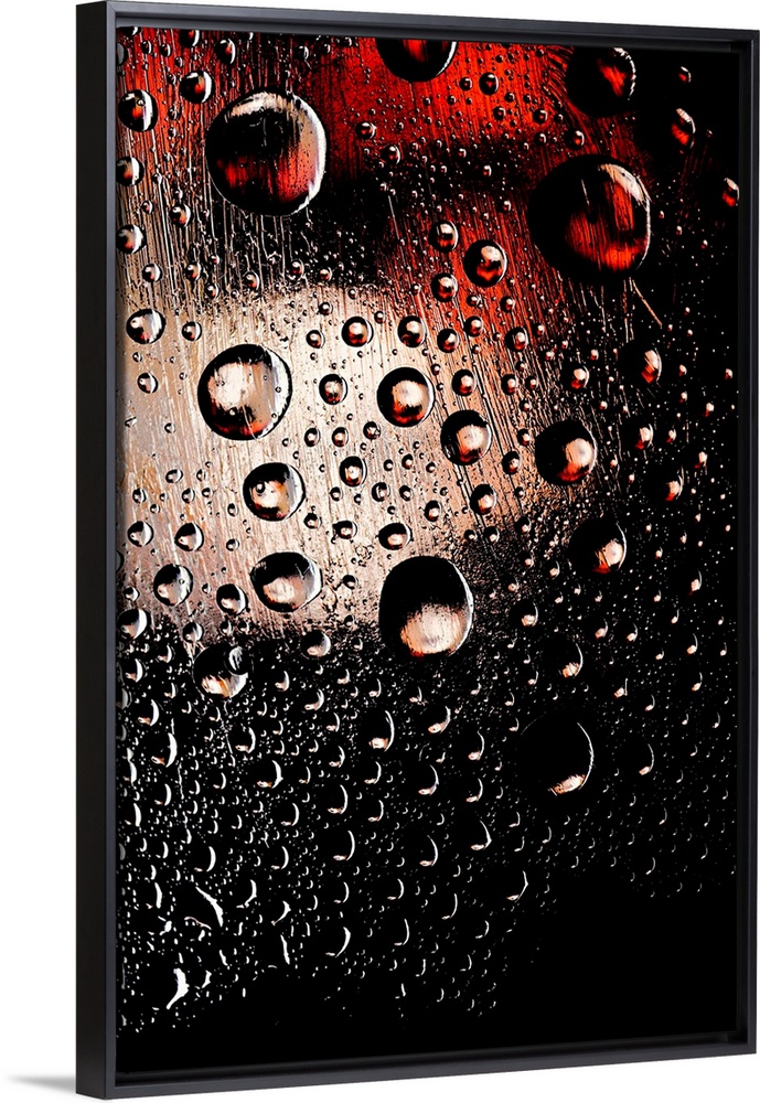 <p>A photo of raindrops sitting on a window with red and white lights shining behind.</p>