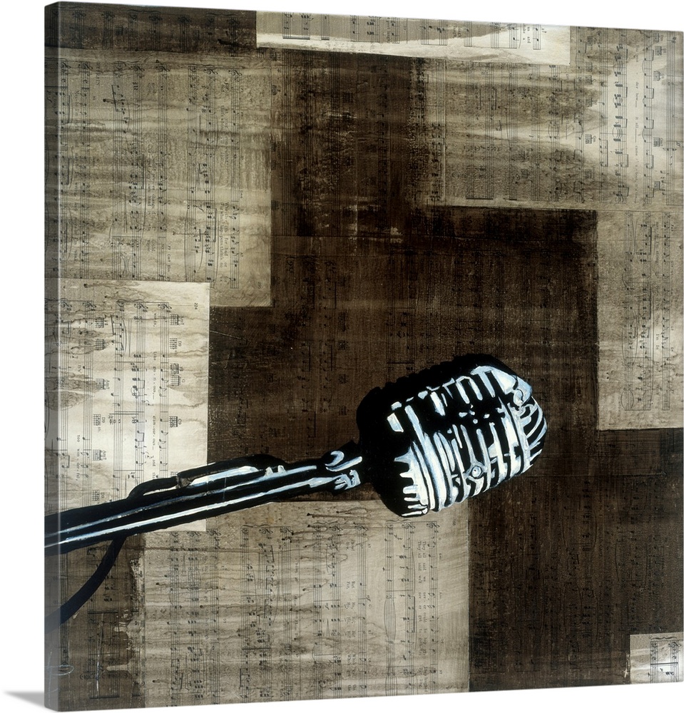 <p>A vintage-style microphone in black and white stands out against a sepia-toned collage of old sheet music and abstract brown blocks, creating a nostalgic and graphic tribute to music.</p>