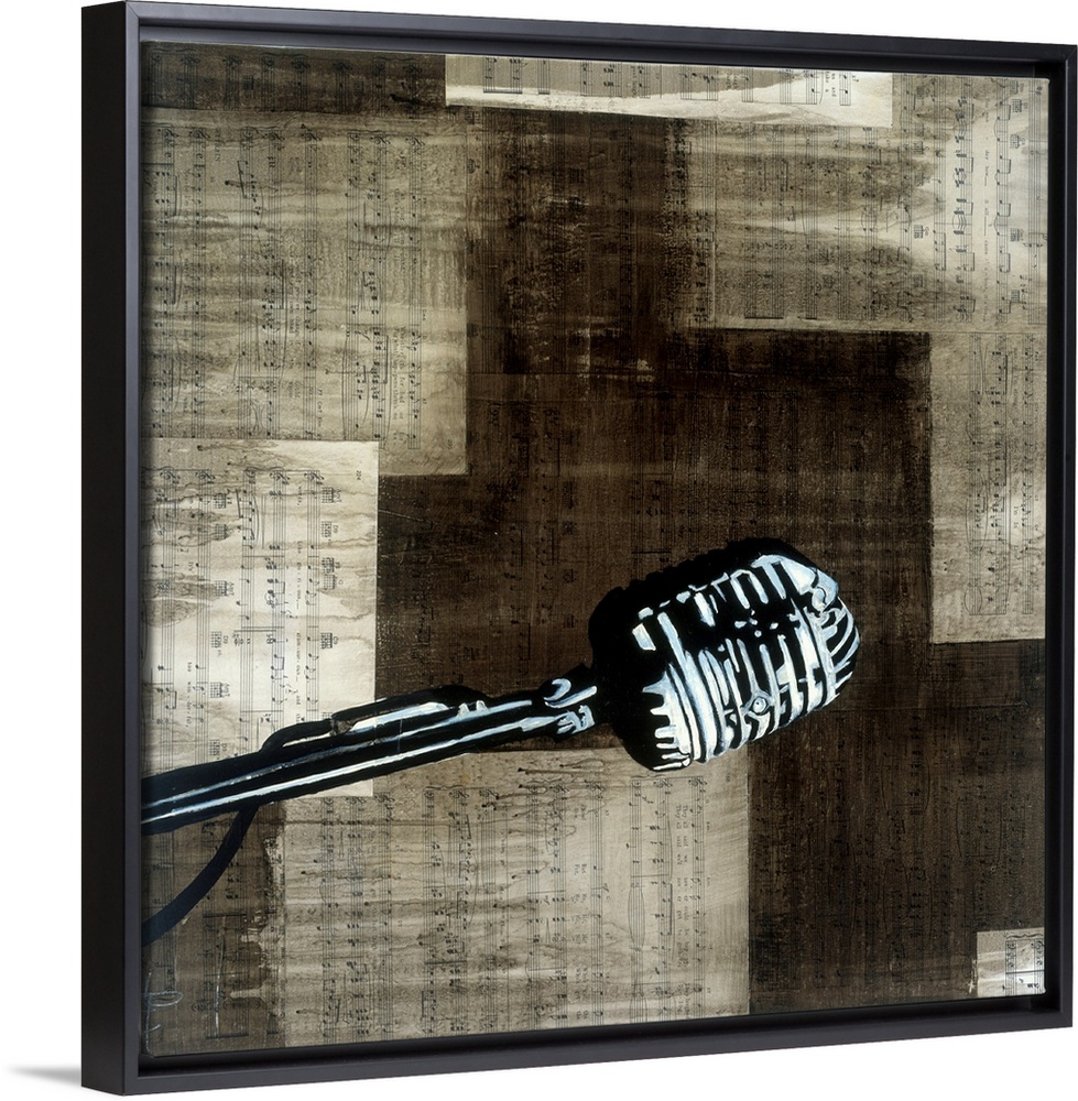 <p>A vintage-style microphone in black and white stands out against a sepia-toned collage of old sheet music and abstract brown blocks, creating a nostalgic and graphic tribute to music.</p>