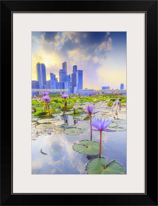 <p>Singapore, Singapore City, Water lilies and city skyline at sunset.</p>