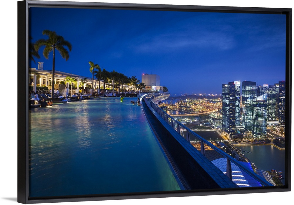 <p>Singapore, Marina Bay Sands Hotel, rooftop swimming pool, dusk.</p>