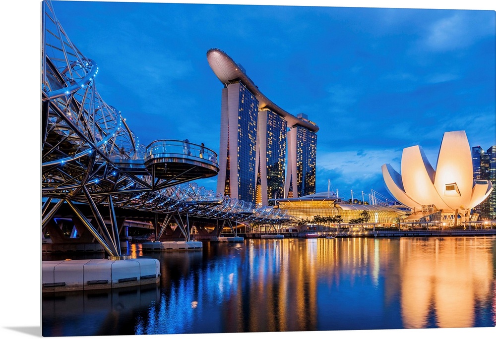 <p>Singapore, Singapore City, Helix Footbridge, Marina Bay Sands Hotel and ArtScience Museum at Marina Bay.</p>