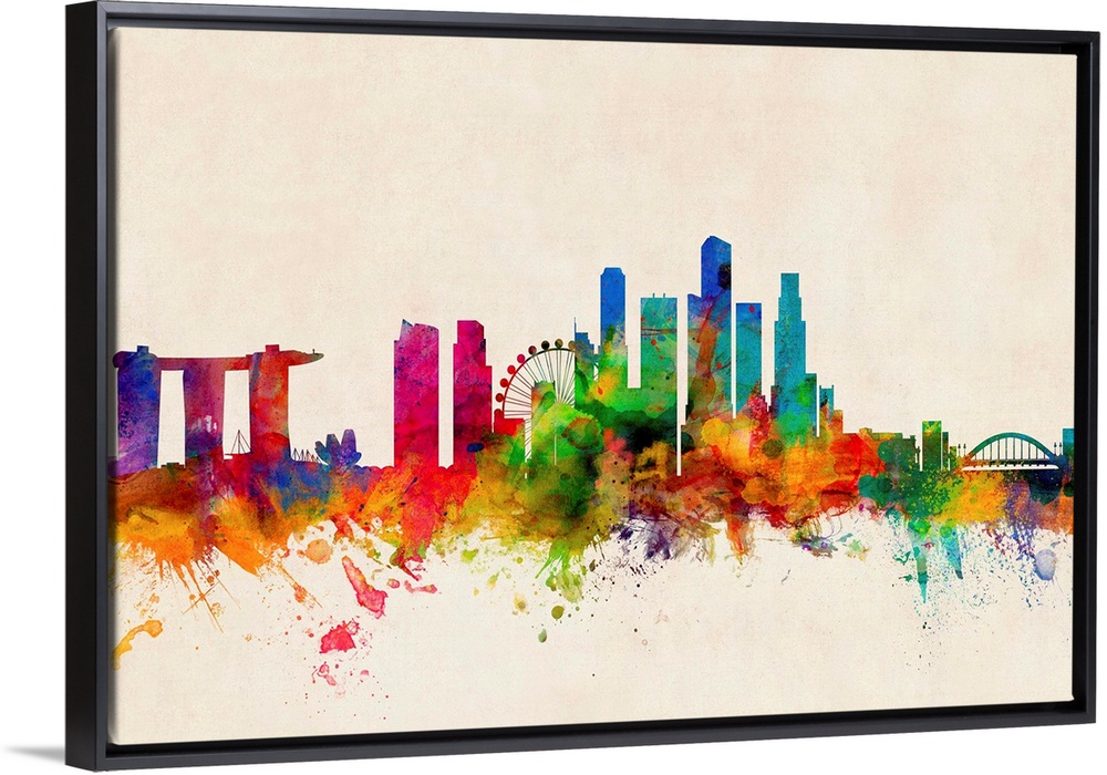 <p>Contemporary piece of artwork of the Singapore skyline made of colorful paint splashes.</p>