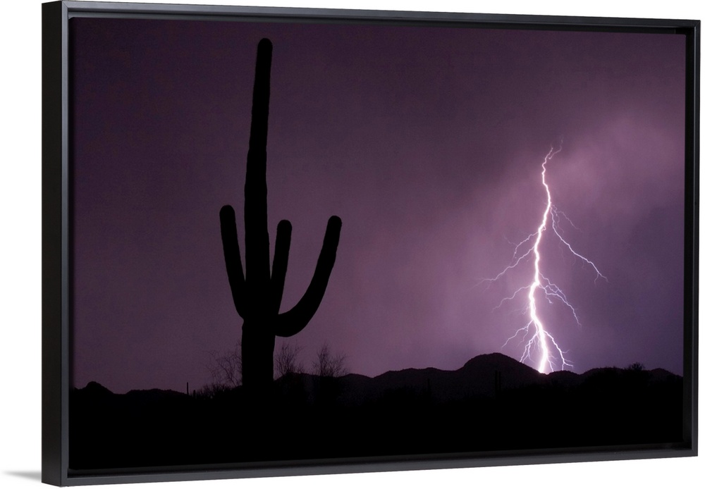 <p>From the National Geographic Collection, a huge photograph at nighttime displays the bright flash of a natural electrical discharge emerging from a cloud and extending towards the dry landscape below. In the foreground, the silhouette of a lone cactus stands in contrast to the mountains in the far distance.</p>