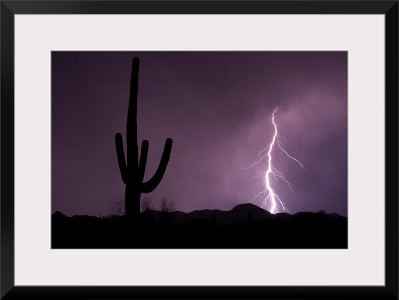 <p>From the National Geographic Collection, a huge photograph at nighttime displays the bright flash of a natural electrical discharge emerging from a cloud and extending towards the dry landscape below. In the foreground, the silhouette of a lone cactus stands in contrast to the mountains in the far distance.</p>