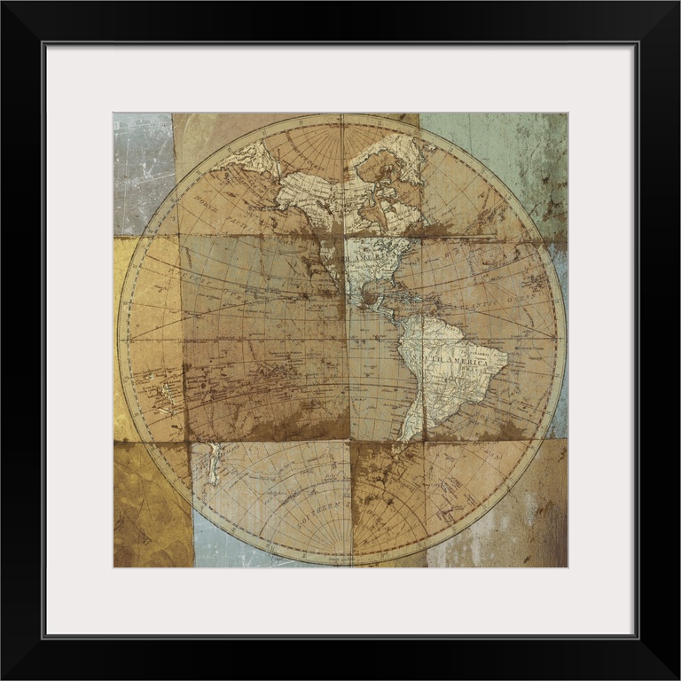 <p>Mixed media artwork with the image of a globe with continents, gridlines, and longitude and latitude overlaying a painting of distressed square tiles.</p>