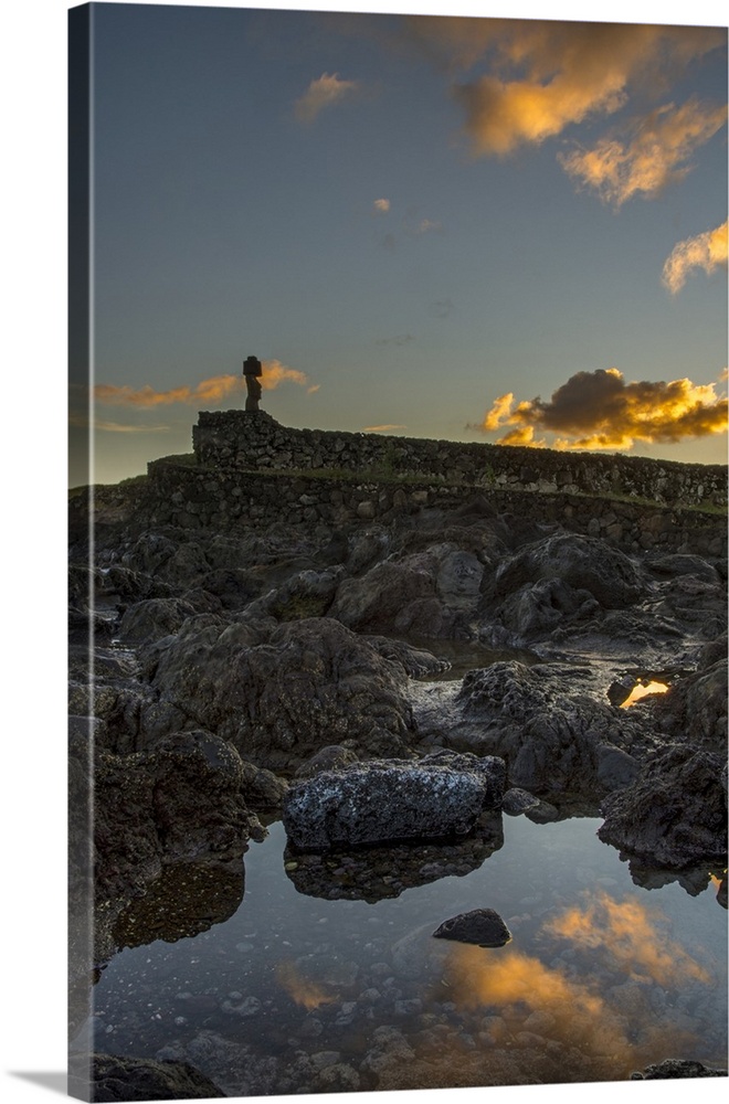<p>A distant single moai is shown against the sunrise lit sky, which reflects in a pool of water in the foreground; Easter Island, Chile</p>