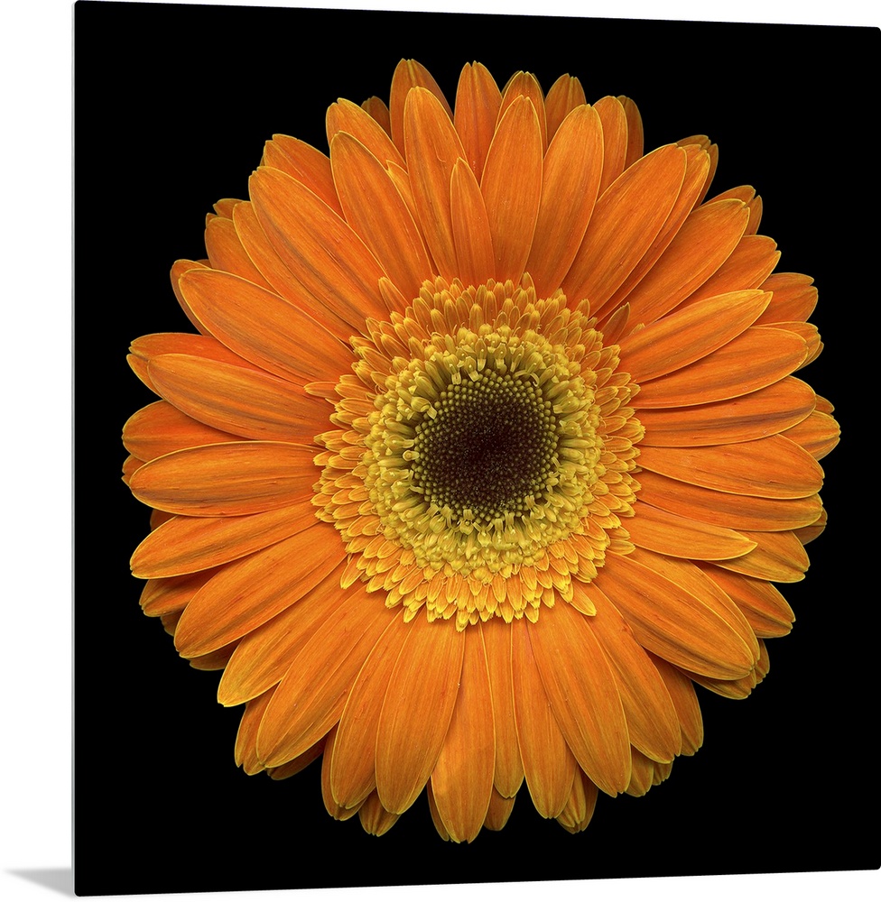 <p>Square, oversized, close up photograph of a vibrant gerbera daisy on a solid black background.</p>