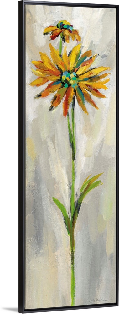 <p>Long vertical contemporary painting of a yellow daisy with brush stoke textured background.</p>