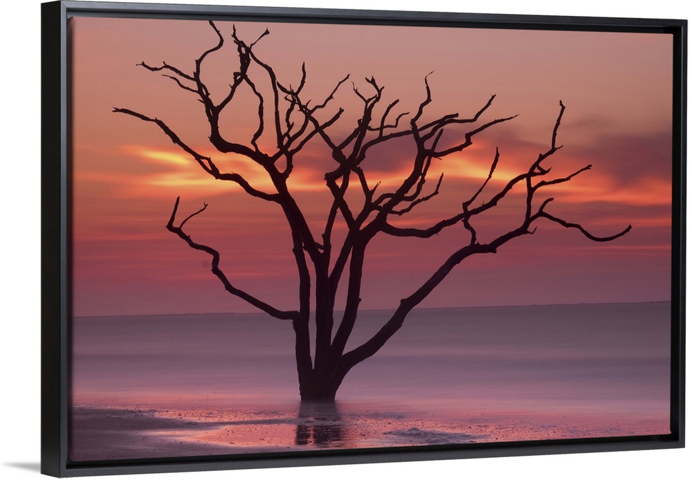 <p>A tree growing in the water off the coast of Botany Bay, South Carolina, under an orange sunset sky.</p>