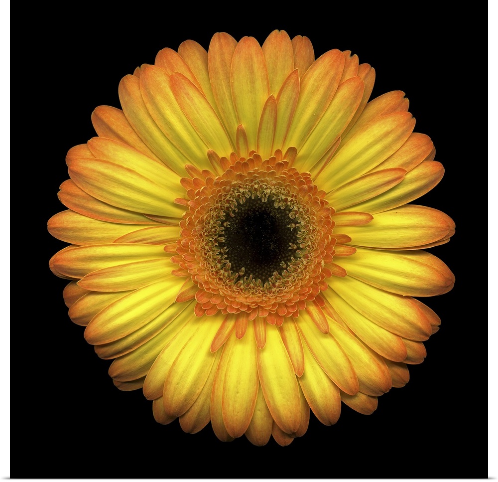<p>The face of a large yellow daisy stands out against a black background.</p>