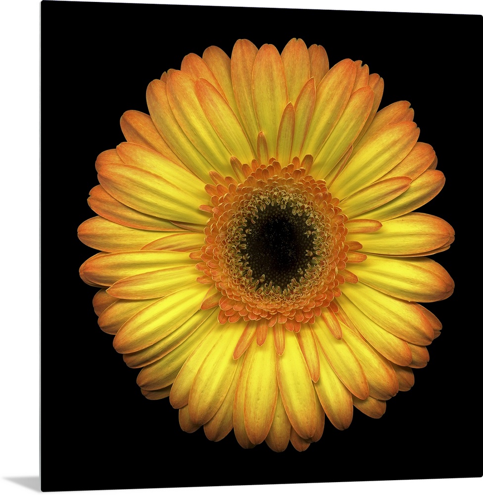 <p>The face of a large yellow daisy stands out against a black background.</p>