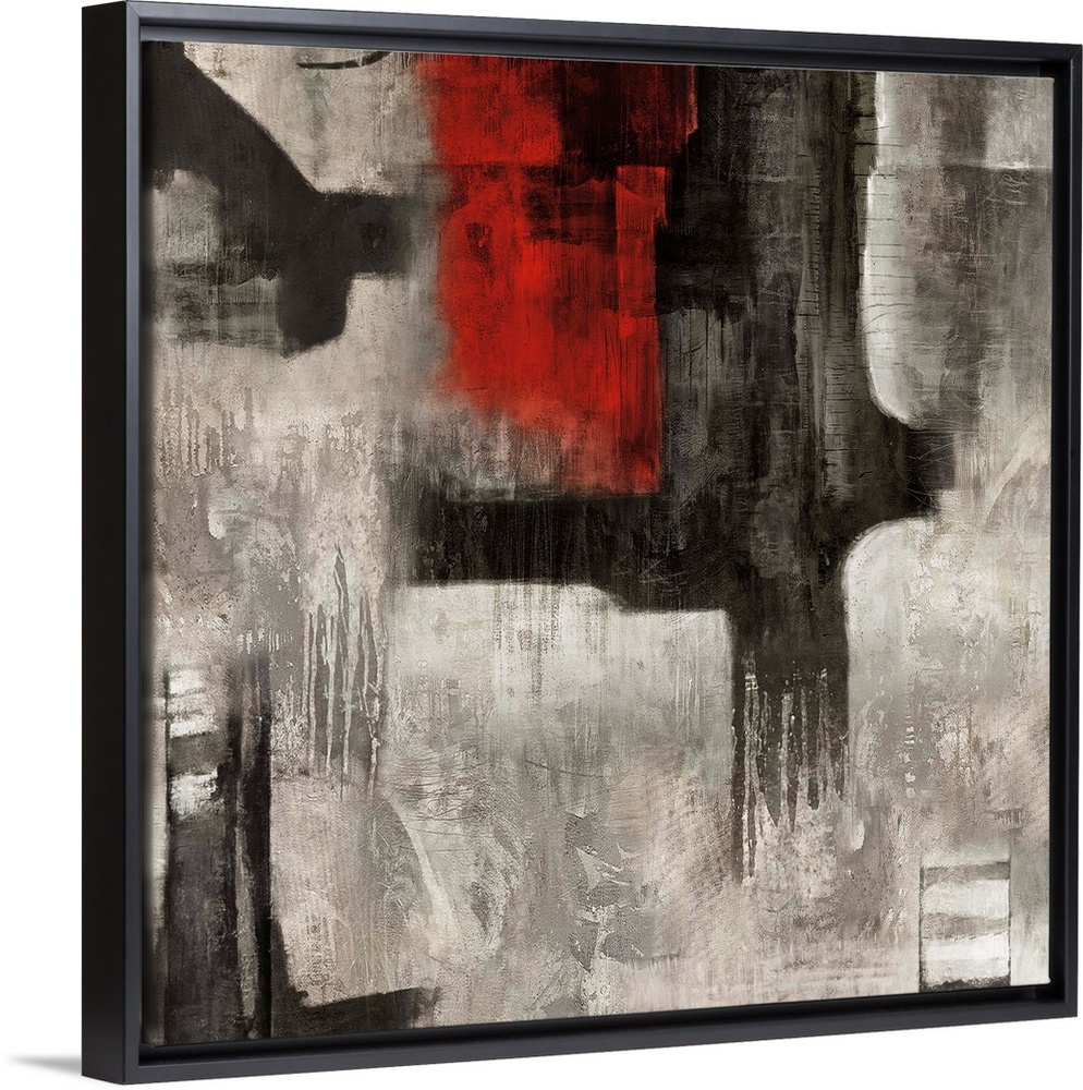 <p>Square abstract painting with bold black and red brushstrokes on top of a white and gray background.</p>