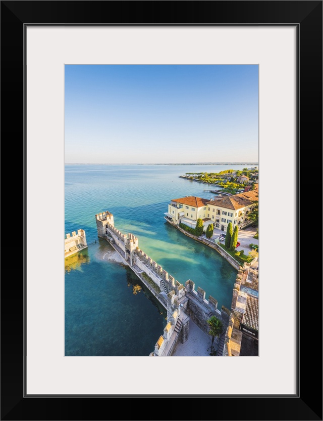 <p>Sirmione, lake Garda, Brescia province, Lombardy, Italy. High angle view of the old town at sunset.</p>