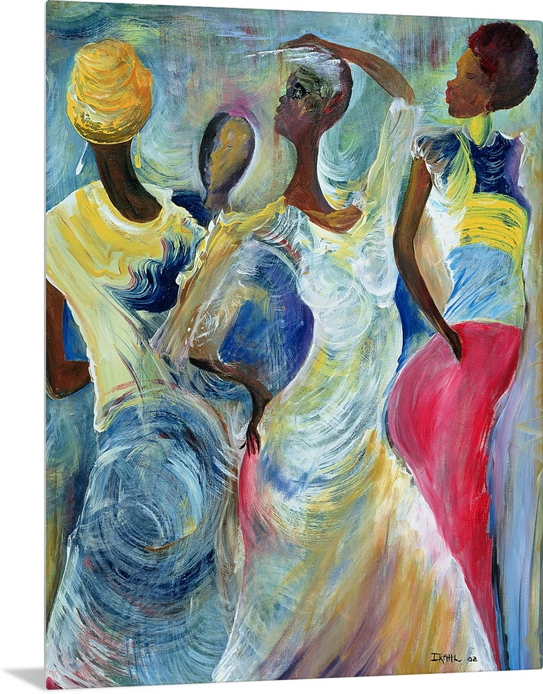 <p>A large vertical painting of four African American women who are dancing. The brush strokes are applied in a swirl motion.</p>