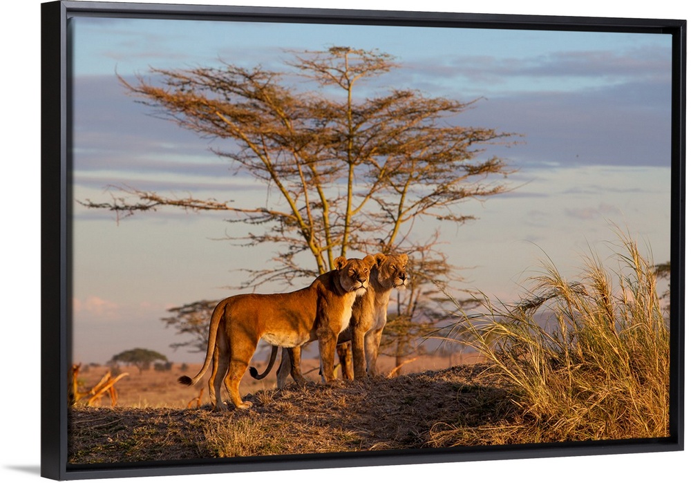 <p>Wildlife photograph of two lionesses in the savannah, Tanzania.</p>