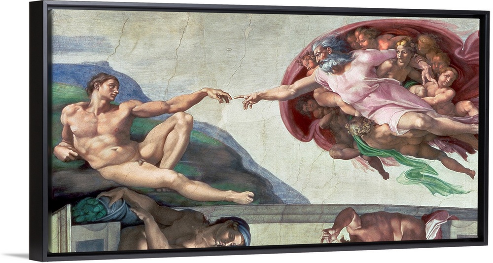 <p>Landscape artwork on a large canvas of The Creation of Adam from the Sistine Chapel Ceiling. God reaching toward Adam as they nearly touch hands, depicting that He is giving Adam the gift of life.</p>