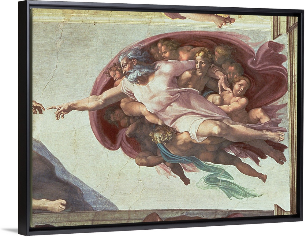 <p>BAL148893 Sistine Chapel Ceiling: The Creation of Adam, detail of God the Father, 1508-12 (fresco) (post restoration) by Buonarroti, Michelangelo (1475-1564); Vatican Museums and Galleries, Vatican City, Italy; Italian, out of copyright</p>