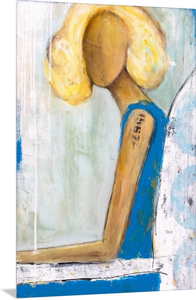 <p>Contemporary painting of a seated blond haired woman wearing a blue dress.</p>