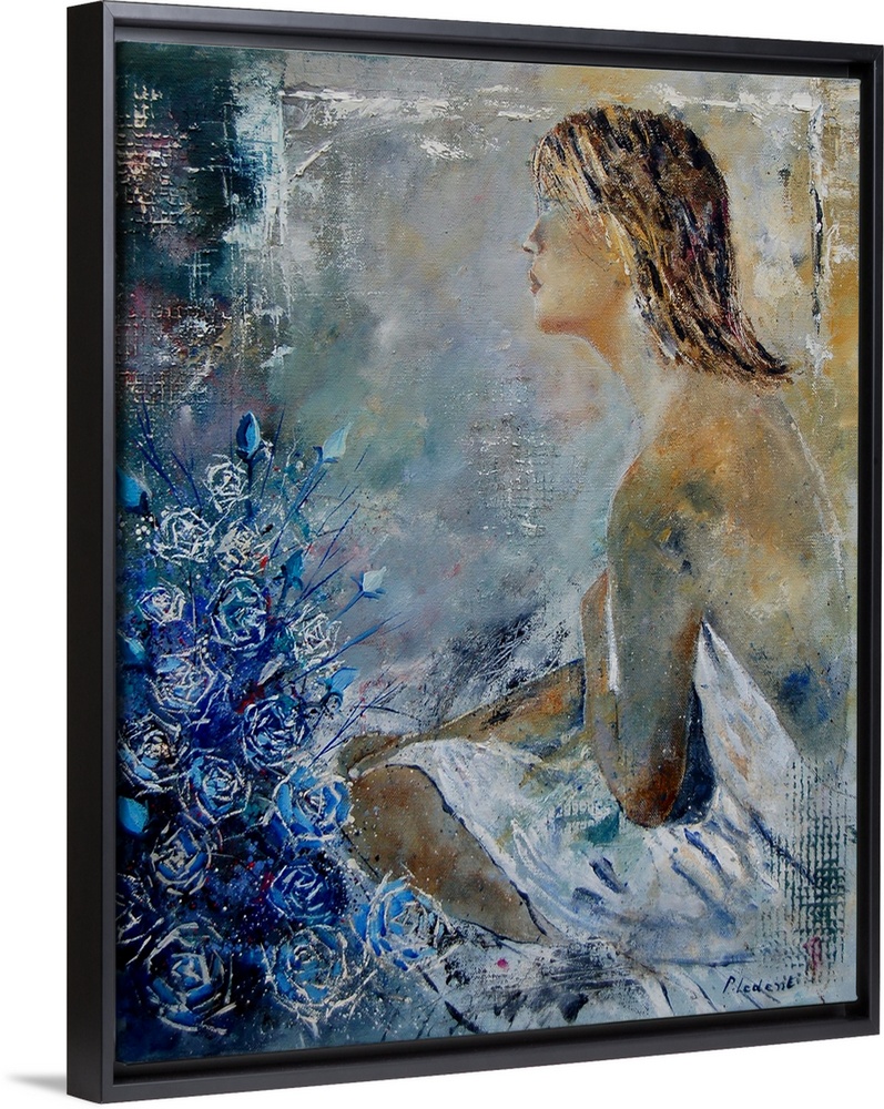 <p>A contemporary painting of female sitting next to blue flowers.</p>
