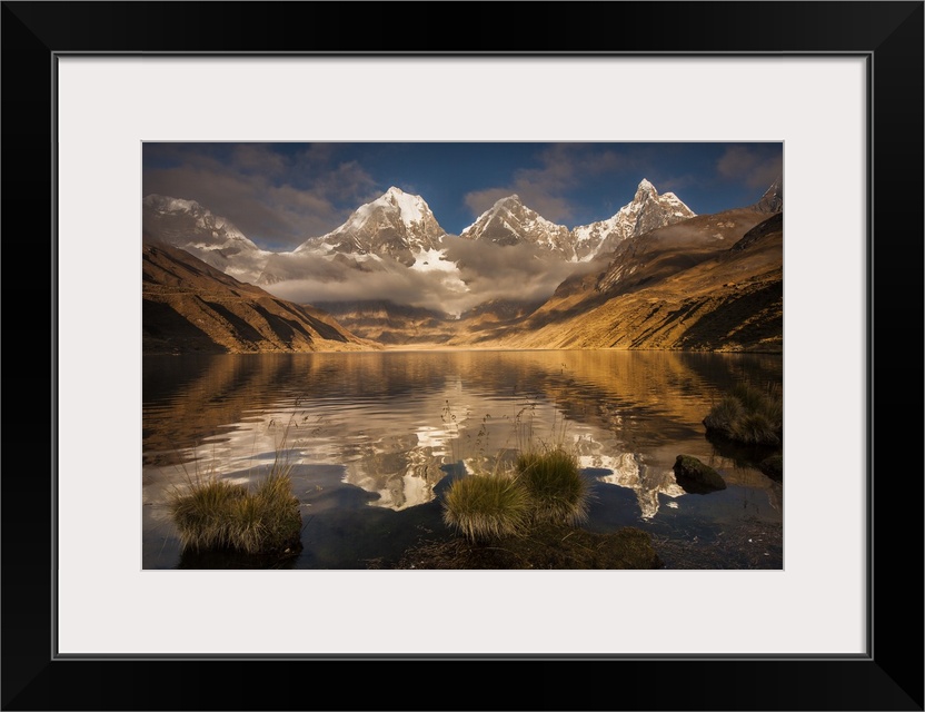 <p>Peaks emerge from morning cloud L to R: Siula Grande, Yerupaja, Yerupaja chico and Jirishanca, reflections in Carhuacocha, Cordillera Huayhaush, Andes mountains, Peru</p>
