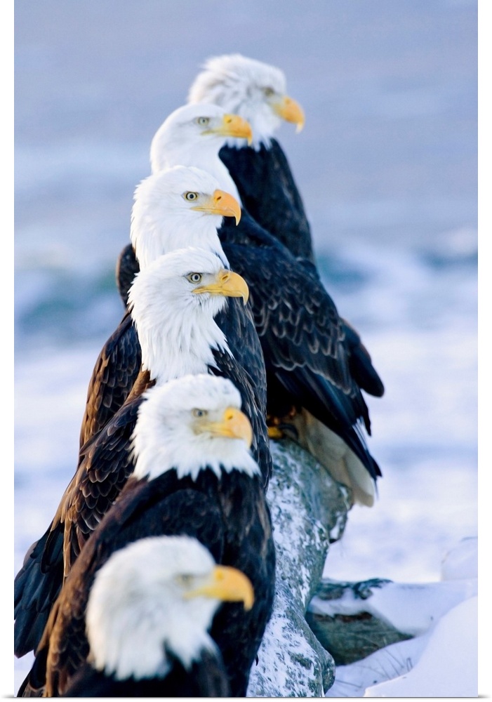 <p>Six Bald Eagles On Log, Homer Spit Kachemak Bay, Kenai Peninsula, Alaska</p>
