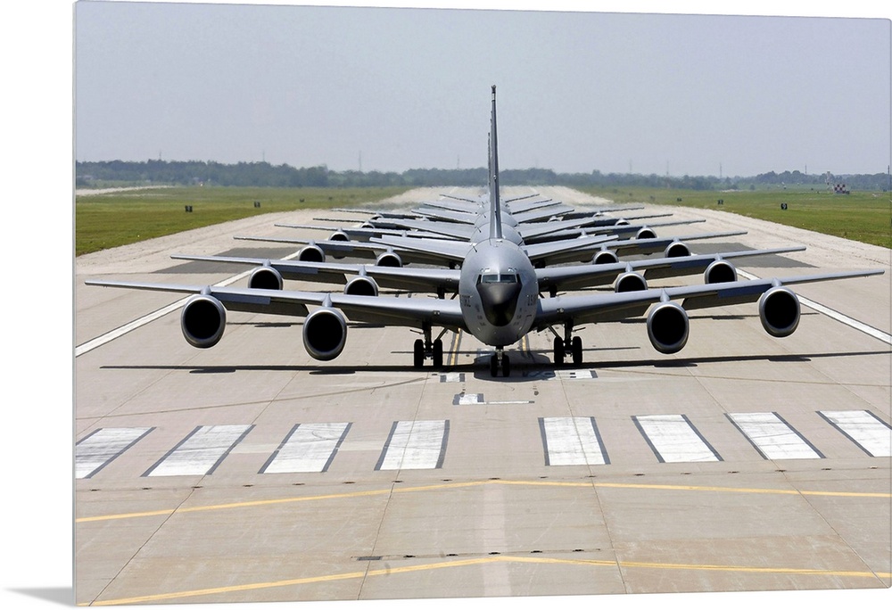 <p>Photograph of several large Stratotanker airplanes perfectly lined up in a row on a runway.</p>