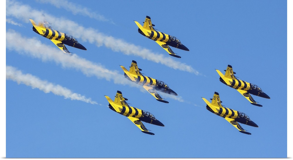 <p>Six L-39C's of the Baltic Bees aerobatic team performing at an airshow in Iran.</p>