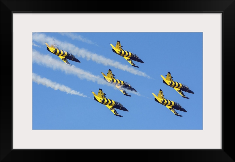 <p>Six L-39C's of the Baltic Bees aerobatic team performing at an airshow in Iran.</p>