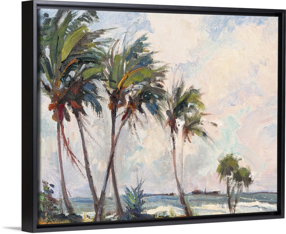 <p>Contemporary painting of six tall palm trees on the beach.</p>