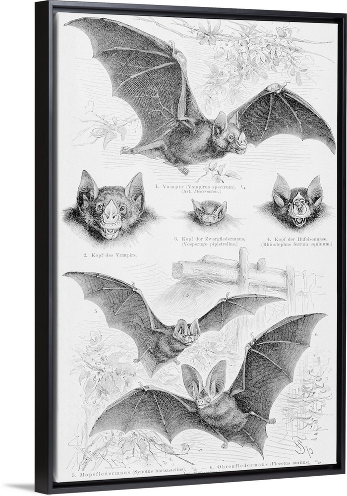 <p>1. Vampir (Vampirus spectrum). 2. Kopf des Vampirs. 3. Kopf der Zwergfledermans. (Vesperago pipistrellas.) 4.Kopf der Hufeisennase. (Rhinolophus ferrum equinum.) 5.Mopsfledermaus (Synotus barbastellus). 6.Ohrenfledermaus (Plecotus auritus).</p>
