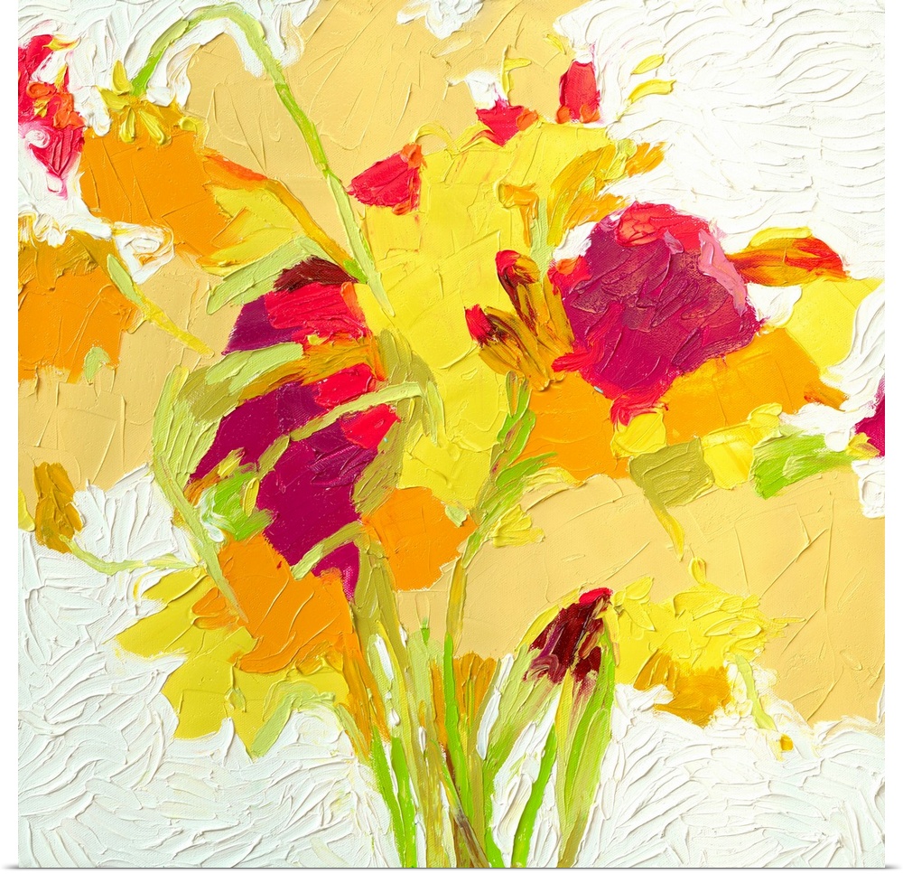 <p>Brightly colored contemporary artwork of a red, yellow, and orange flowers.</p>