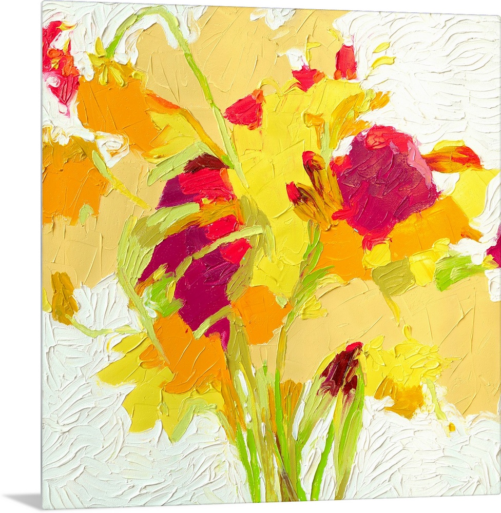 <p>Brightly colored contemporary artwork of a red, yellow, and orange flowers.</p>