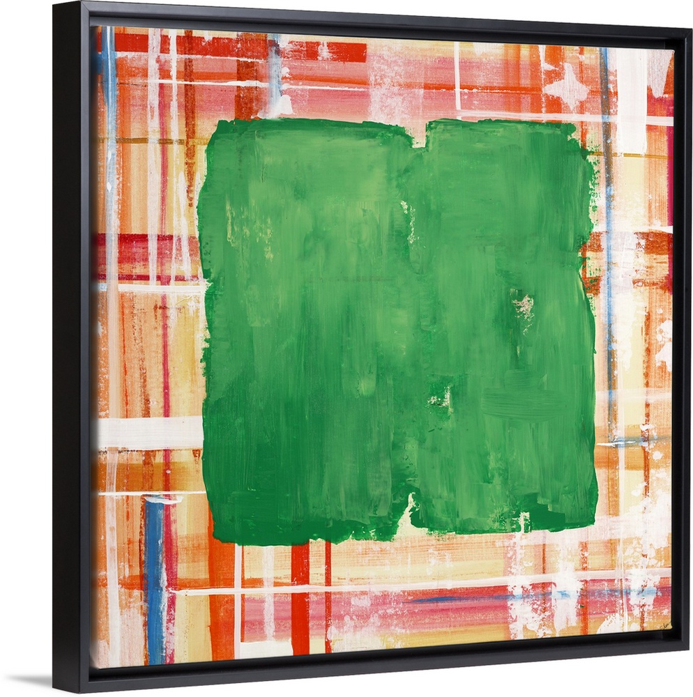 <p>Contemporary abstract with a green square shape over a plaid design.</p>