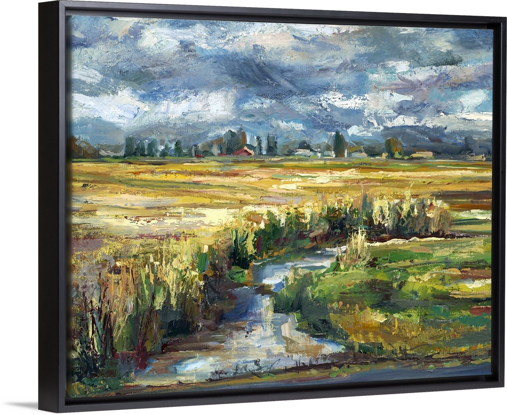 <p>Contemporary landscape painting of a plains with a creek running through it.</p>
