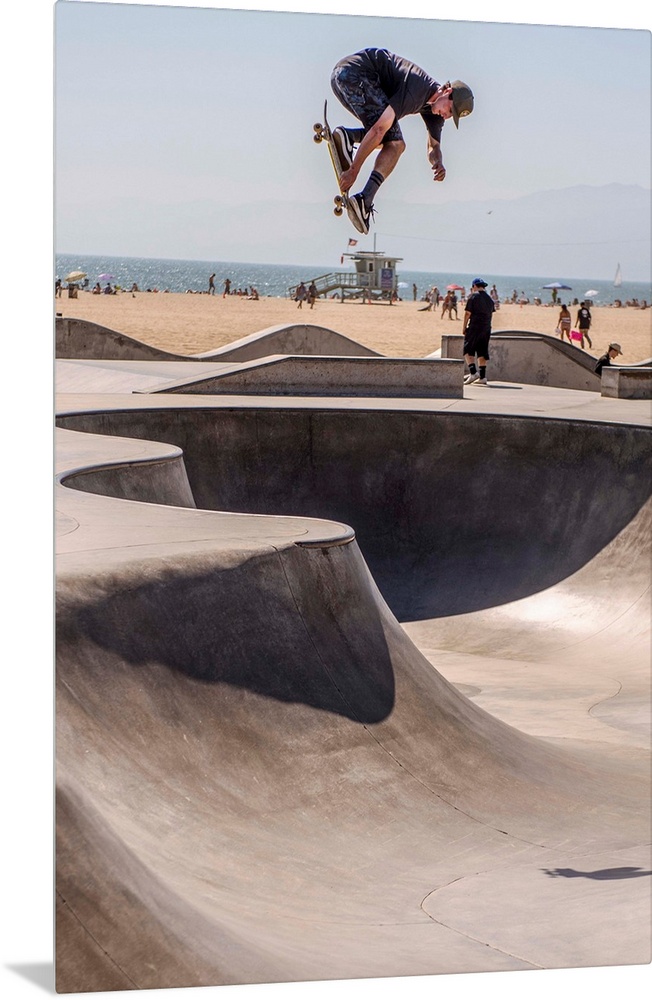 <p>A local skater is in mid-air at Venice's seaside skate park, Los Angeles.</p>