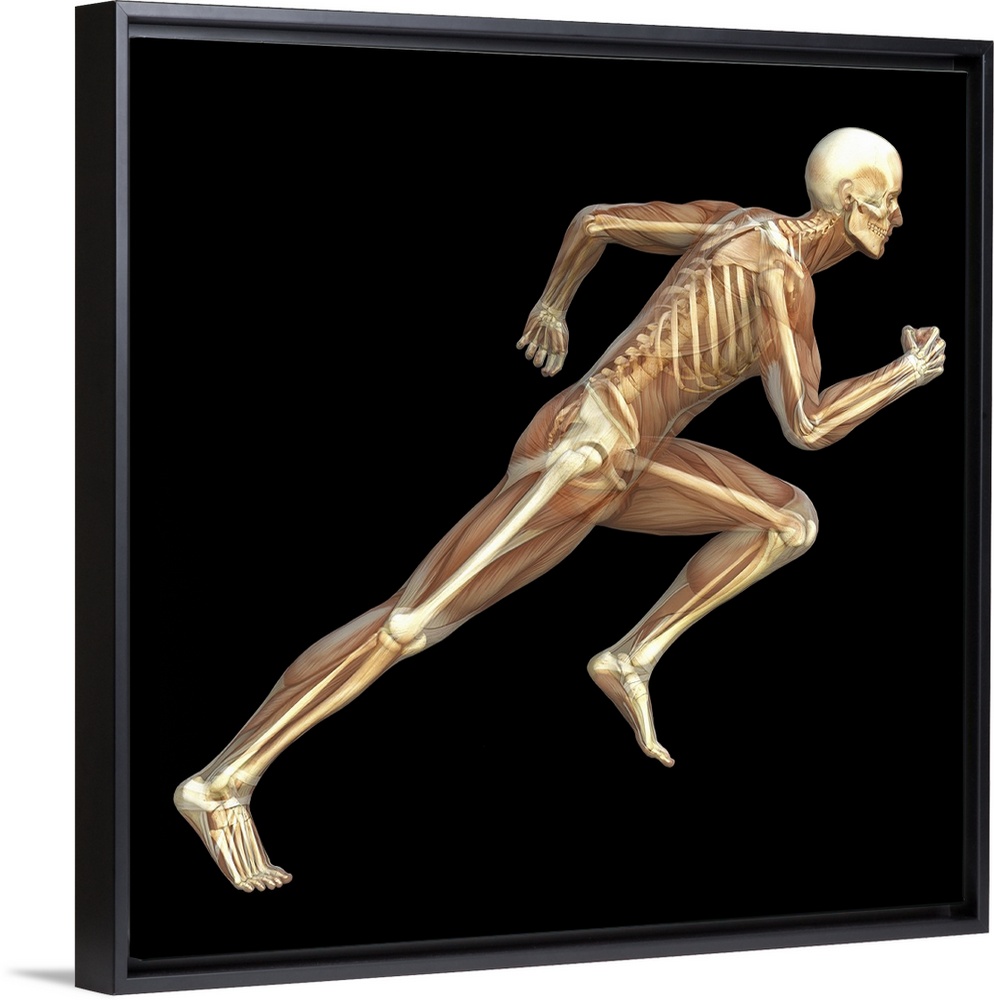 <p>Skeleton sprinting. Computer artwork of the bones and musculature of a man running. The bones of the skeleton provide a structural framework and protect the internal organs. The skeletal muscles, responsible for movement and posture, can also be seen.</p>