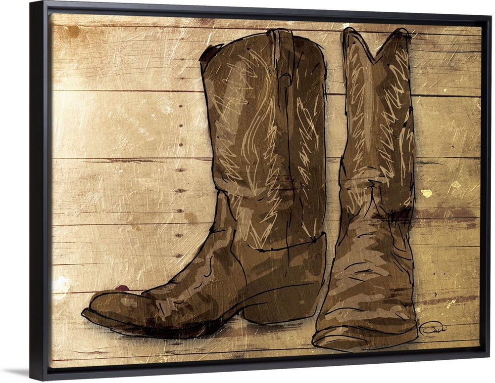 <p>A sketch of brown cowboy boots on a rustic wood paneled background.</p>
