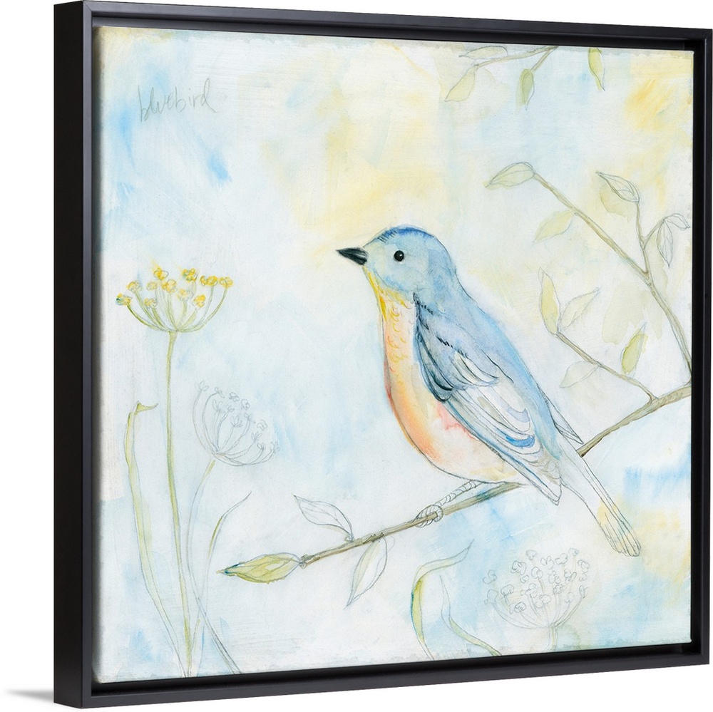 <p>Square sketch of a bluebird perched on a branch and surrounded by leaves and flowers, all colored in with watercolors.</p>