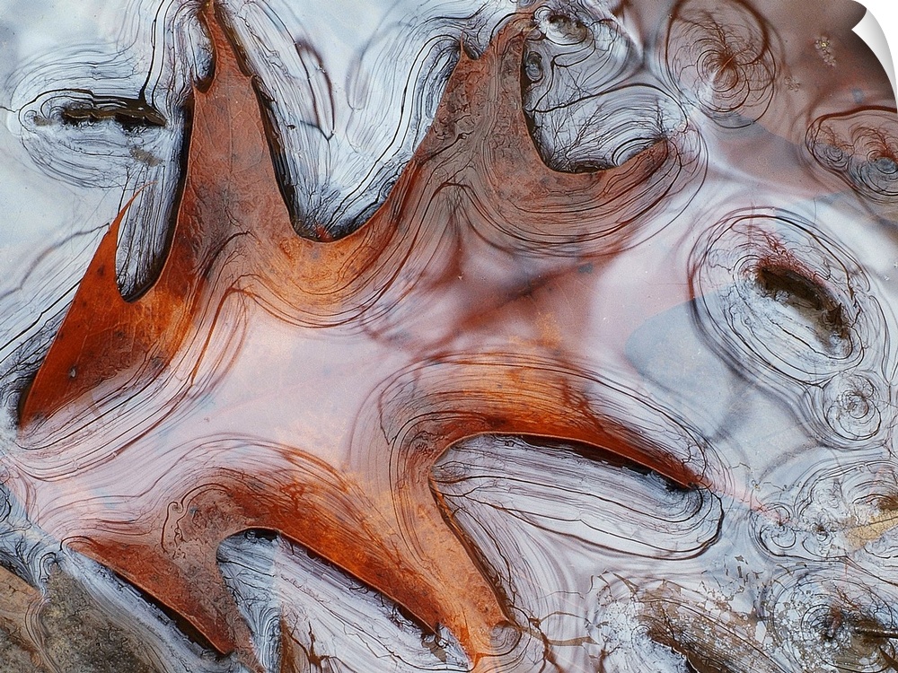 <p>Extreme close up an autumn leaf submerged in water.</p>
