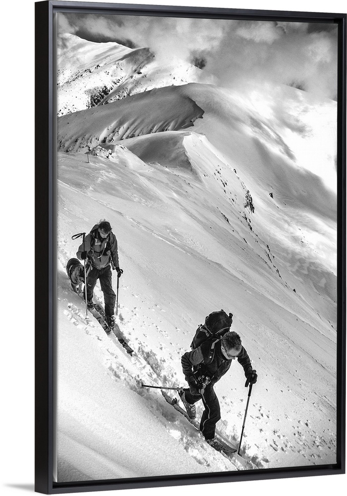 <p>Two people and a dog trek through the snow on an alpine mountaintop.</p>