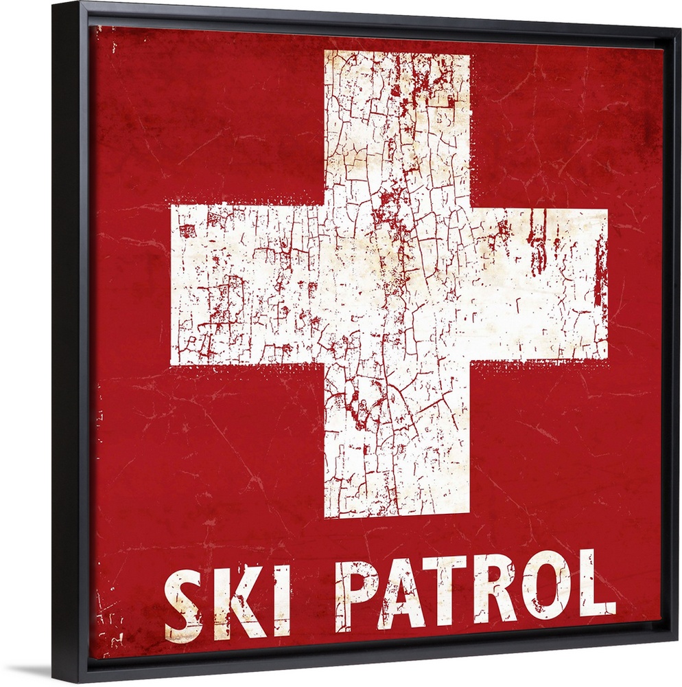 <p>A worn, distressed, cracked and rusty Ski Patrol ski sign.</p>