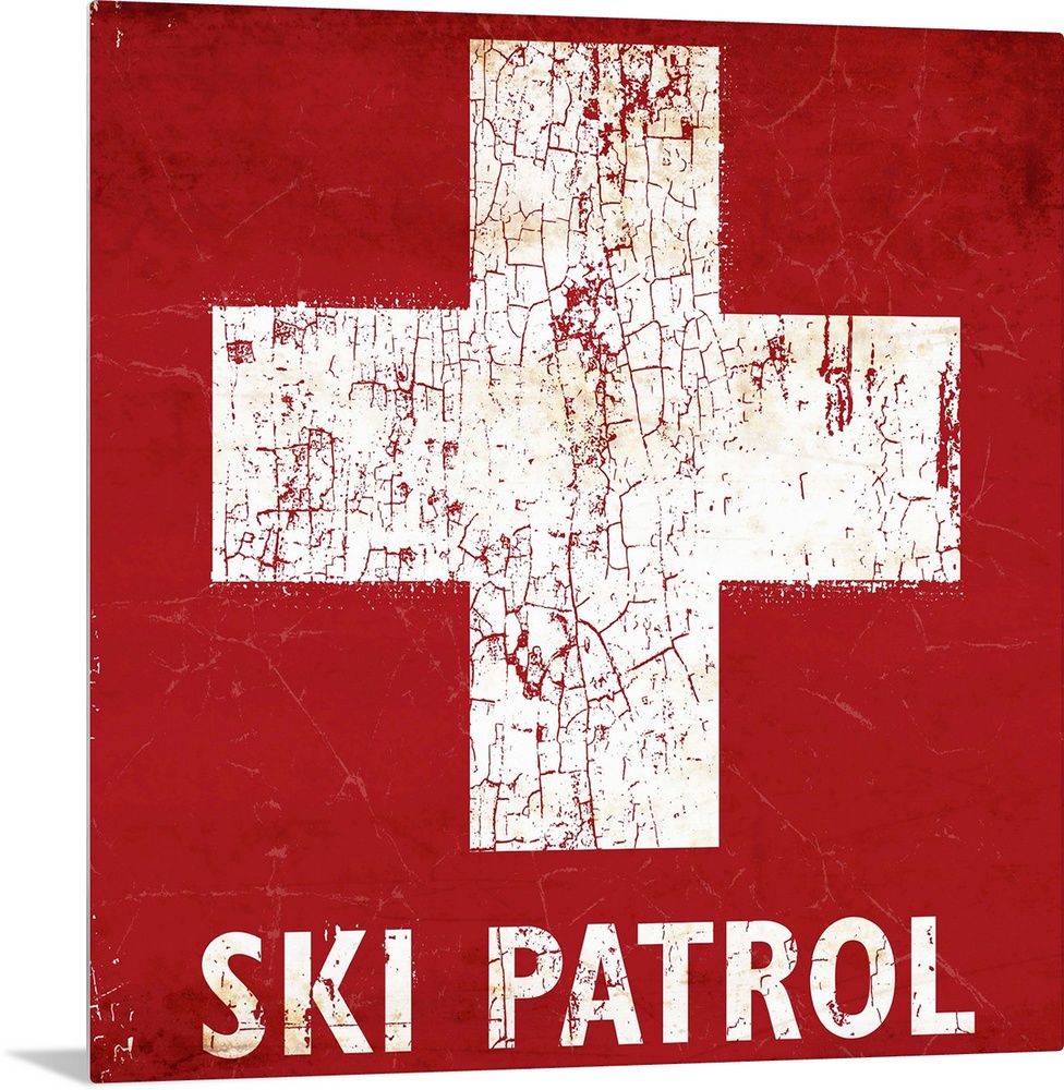 <p>A worn, distressed, cracked and rusty Ski Patrol ski sign.</p>